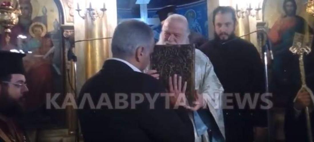 Ο Μητροπολίτης Καλαβρύτων, αφού το έδειξε και εξιστόρησε το γεγονός, προέτρεψε τον υπουργό να το ασπαστεί. Ωστόσο, ο Πάνος Σκουρλέτης αρνήθηκε με το χέρι του και ο Μητροπολίτης... πάγωσε, συνεχίζοντας την ομιλία του.