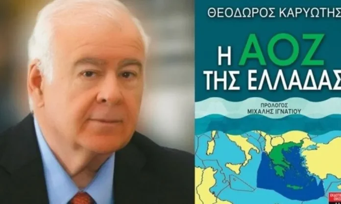 Ο καθηγητής Θεόδωρος Καρυώτης και το εξώφυλλο του βιβλίου του “Η ΑΟΖ της Ελλάδας”. Φωτογραφίες αρχείου
