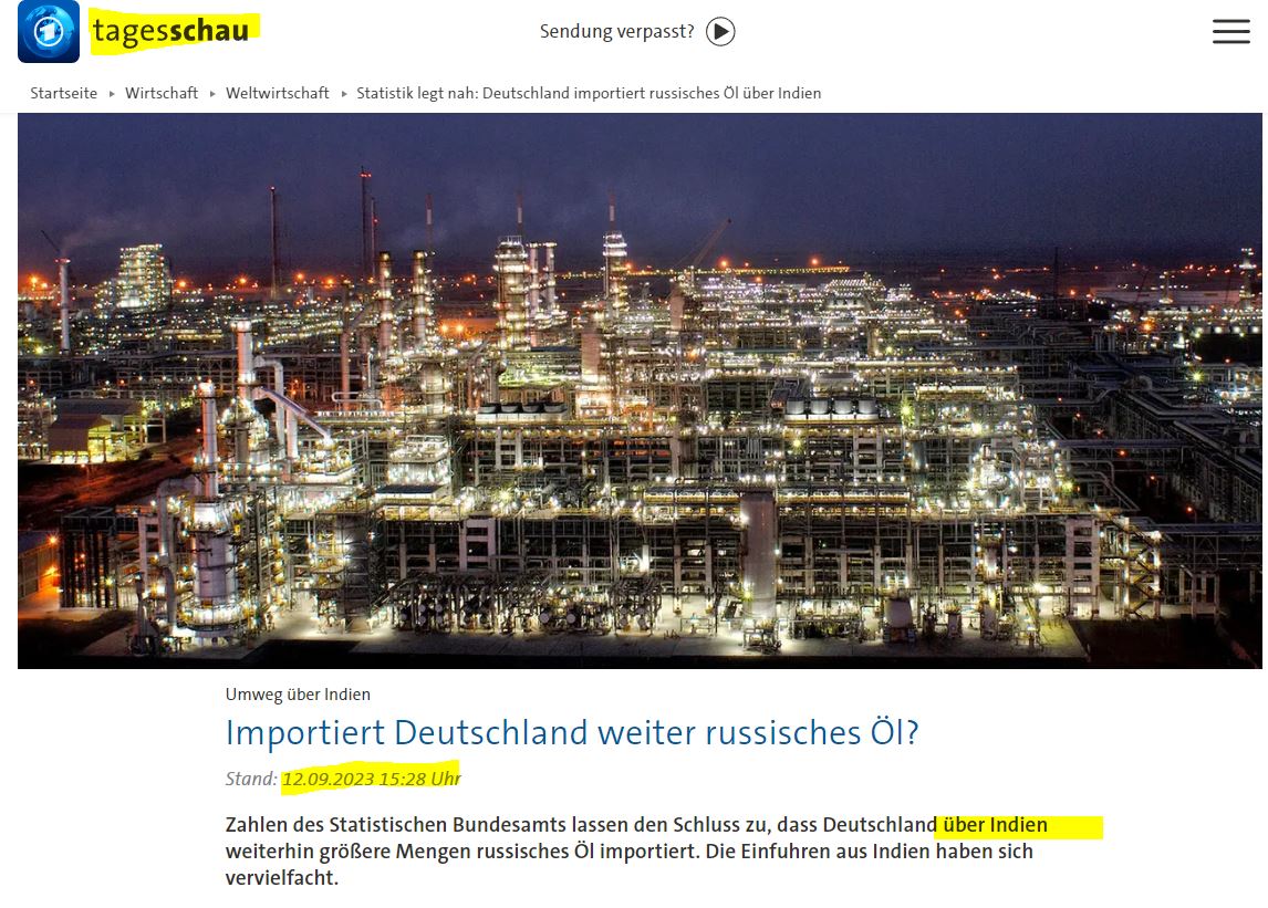 Παρά τους περιορισμούς στις εισαγωγές, η Γερμανία προφανώς εξακολουθεί να εισάγει μεγάλες ποσότητες πετρελαίου από τη Ρωσία μέσω Ινδίας, ανακοίνωσε σήμερα η Ομοσπονδιακή Στατιστική Υπηρεσία της Γερμανίας, σύμφωνα με το γερμανικό μέσο Der Spiegel.